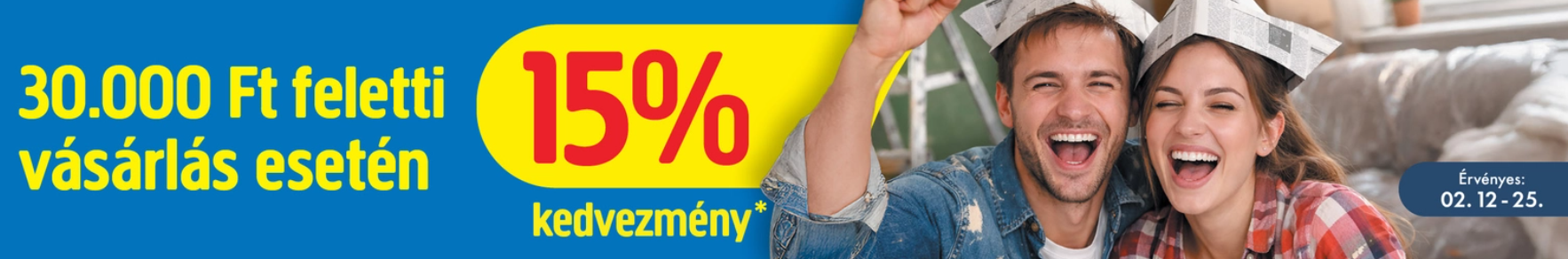 A 15% kedvezmény bármely Praktiker áruházban és a webshopban, 2026. február 12. és február 25. között történő, legalább 30.000 Ft összértékű vásárlás esetén érvényes. Ez a kedvezmény más akcióval, kedvezménnyel nem vonható össze, továbbá az egyedi grafikai jelöléssel megkülönböztetett termékekre nem vonatkozik: „Akció”, „Online akció”, „Ütős ár”, „Kiárusítás”, „Kizárólag online”. Vásárolj legalább 30.000 Ft összértékben, és áruházi vásárlás esetén a kasszáknál, online vásárláskor pedig a kosároldalon kerül levonásra a 15% kedvezmény azon áruk értékéből, amelyek nincsenek ellátva az előbbiekben felsorolt egyedi grafikai jelöléssel.